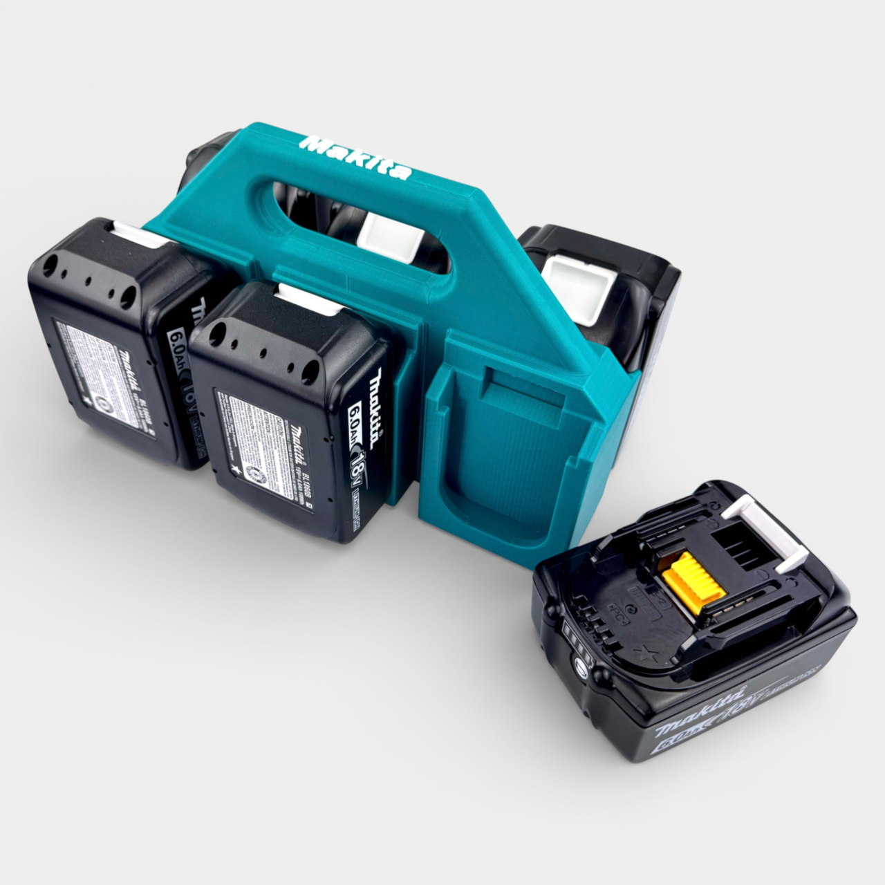 Acest suport tip "Caddy" este soluția supremă pentru profesioniști. Îți permite să transporți în siguranță 6 acumulatori Makita 18V LXT simultan, ținându-i organizați, protejați și gata de utilizare.